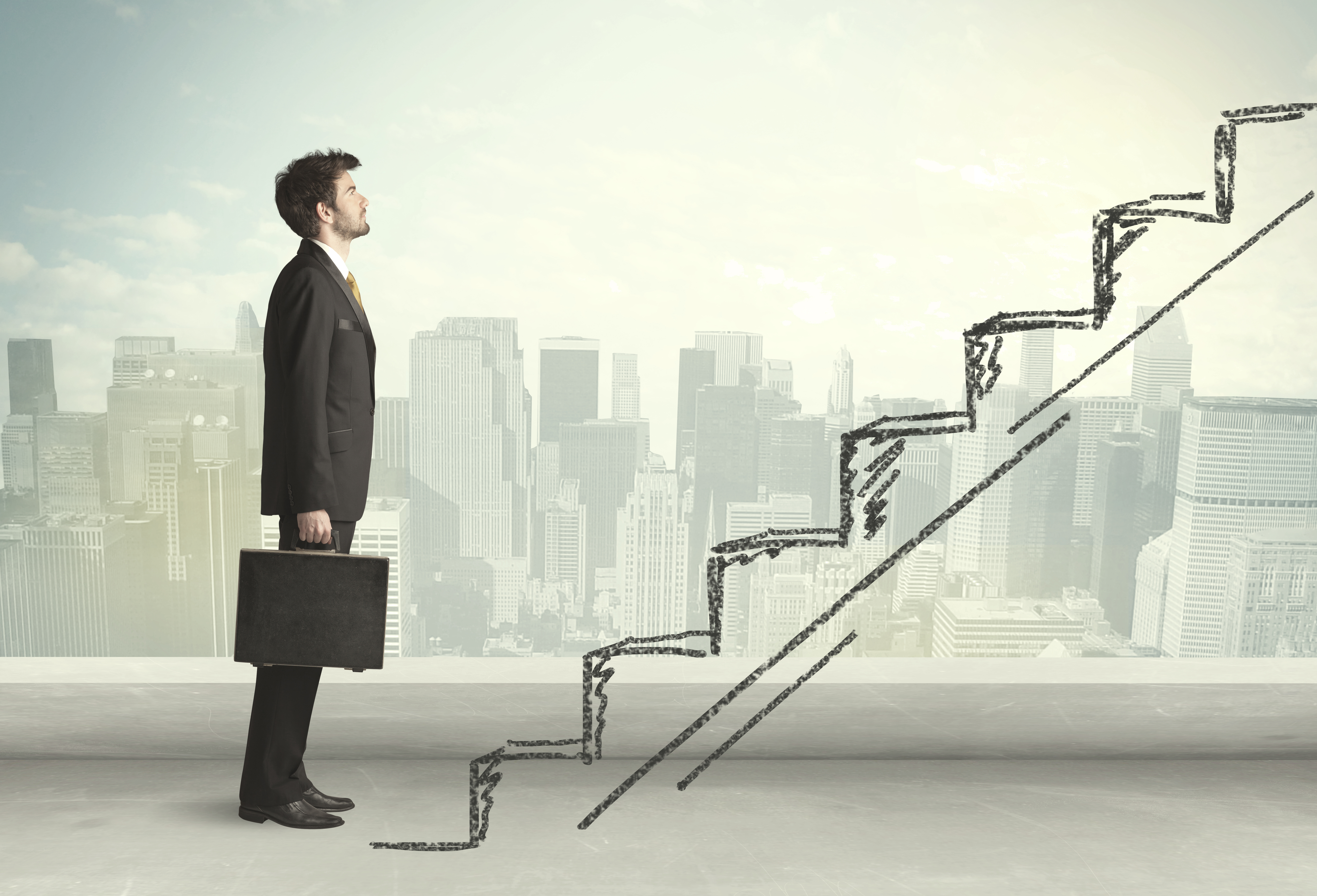 Business man climbing up on hand drawn staircase concept
